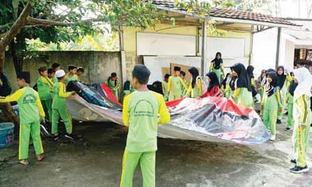 Huda 2, Kota Bogor beramairamai memindahkan spanduk bekas yang akan dijadikan sebagai alas belajar di tengah lapangan, Jumat (17/10).