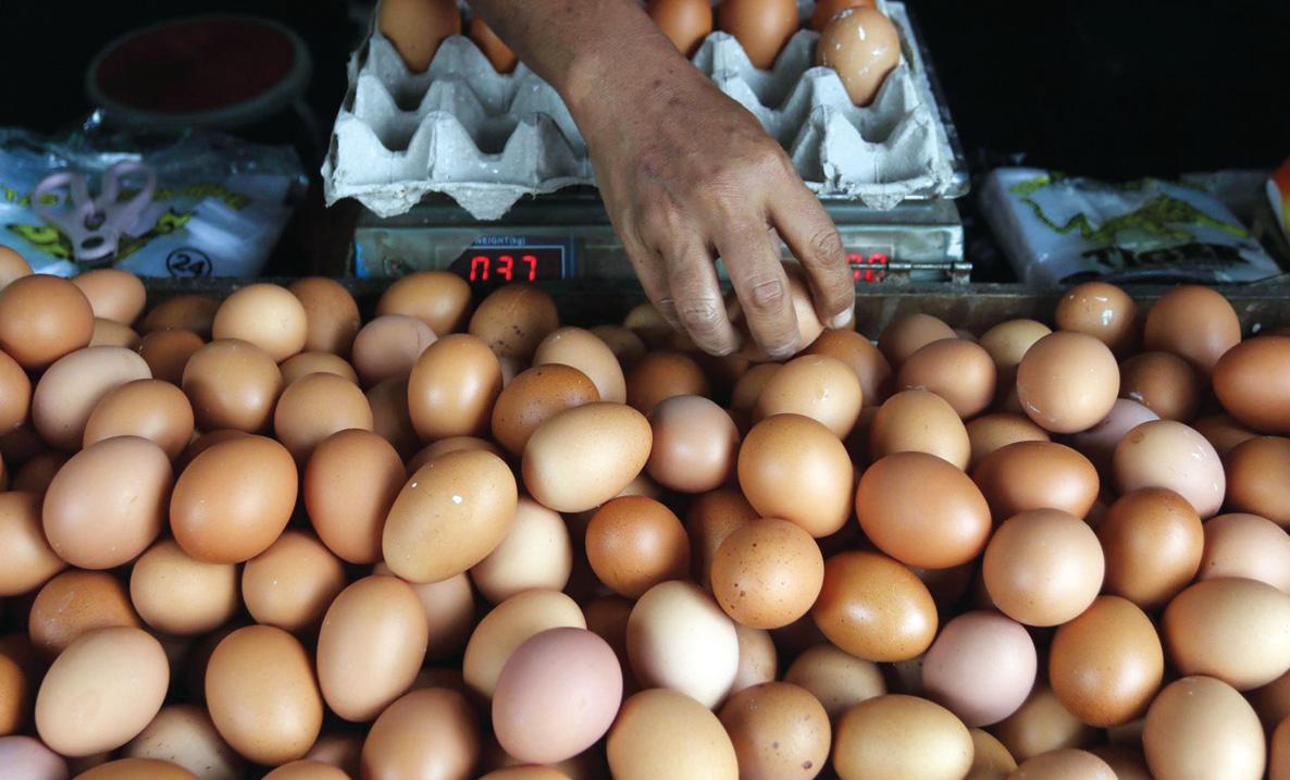 MERANGKAK NAIK: Pedagang merapihkan telur ayam. Harga telur