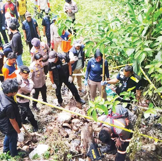 Penemuan kerangka di Kali/Jembatan Cilalay, setelah saksi kunci memberi petunjuk; penyisiran dibantu anjing pelacak.