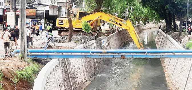BERSIHKAN KALI: Pekerja mengoperasikan alat berat membersihkan aliran kali yang baru selesai dibangun tanggul di kawasan Rawalumbu, Kota Bekasi, Senin (24/11). Pemerintah Kota (Pemkot) Bekasi tengah mengebut penyelesaian berbagai proyek pembangunan fisik menjelang akhir tahun 2025 yang baru mencapai 70 persen.
