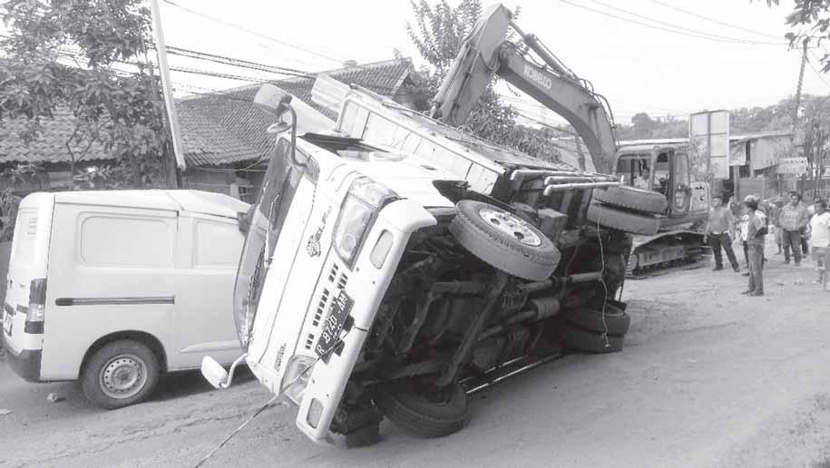 ”Saat di lokasi kejadian, truk colt diesel kehilangan kendali saat melintas di jalan yang bergelombang sehingga terguling,” ungkapnya di lokasi kejadian. Mobil truk tersebut seketika menimpa mobil mini bus dari arah sebaliknya. Sopir mini bus bernama Susmanto sontak melompat sebelum kejadian untuk menyelamatkan diri dari pintu kiri mobil. ”Tidak ada korban jiwa, kedua