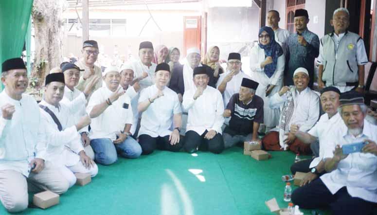 BERI BANTUAN: Wabub Ade Ruhandi bersama Pimpinan Pondok Moder Ummul Quro Al Islami usai salat Jumat berjamaah dan berziarah serta menghadiahkan paket umrah kepada imam, khatib, dan bilal.