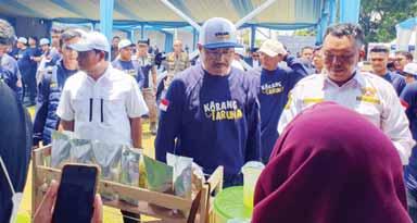 HADIRI: Mensos Syaifullah Yusuf melihatlihat stan yang tersedia dalam perayaan puncak Bulan Bakti Karang Taruna di Alun Alun Cirimekar Cibinong.