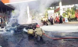 terbakar sedikit,” ungkap Yudi kepada Radar Bogor. Yudi mengungkapkan, peristiwa bermula ketika mobil milik Makmur sedang mengantri untuk mengisi bahan bakar. Saat itu, Makmur merasakan panas pada bagian belakang tubuhnya, lalu mendapati api sudah cukup besar menyala di mobil. “Pak Makmur kemudian menjauhkan mobil dari mesin pengisian BBM dan langsung keluar menyelamatkan diri,” tambahnya. Petugas Pos Damkar Citeureup bersama pihak keamanan SPBU dan Sentul City bergerak cepat melakukan pemadaman. Api berhasil dikendalikan, situasi dinyatakan kondusif, dan tidak ada korban jiwa dalam kejadian tersebut. Sementara itu, satu unit mobil pick up terbakar hangus. (Cr1/c)