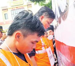 TERTUNDUK: Para pelaku kriminal pembobol ATM saat mengikuti konferensi pers yang dilakukan Polresta Bogor Kota, di Makopolresta Bogor Kota, kemarin.