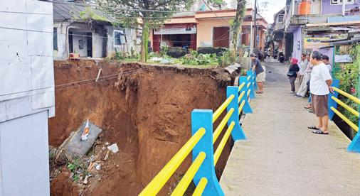 membawa potensi bahaya kepada jembatan. “Kami berharap segera ada tindak lanjut untuk penguatan area tersebut karena memang potensinya berbahaya,” ucapnya. Theo menyarankan kepada warga setempat, untuk menutup sementara akses jembatan saat kondisi hujan deras untuk menghindari jatuhnya korban. “Namun saat cerah bisa dilewati kembali,” lanjut dia. Longsor di titik itu, tak berselang lama setelah jembatan di Gang Warung Pala, RT 04/02, ambruk lebih dulu, Senin (27/2).(fat/c)