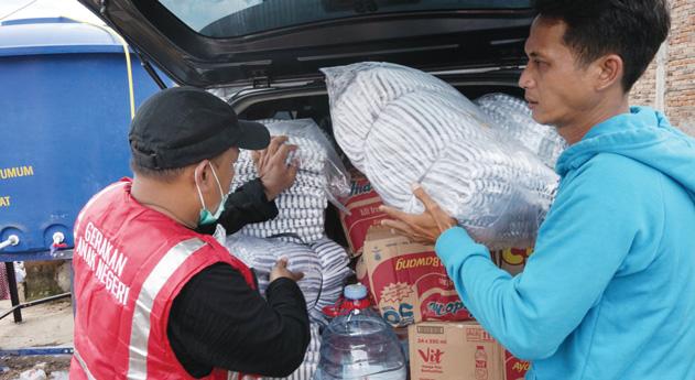 Penanggung Jawab GAN, Hazairin Sitepu dan tim membagikan berbagai kebutuhan ibu dan anak kepada para pengungsi di Kampung Longkewang, Desa Gasol, Kabupaten Cianjur.