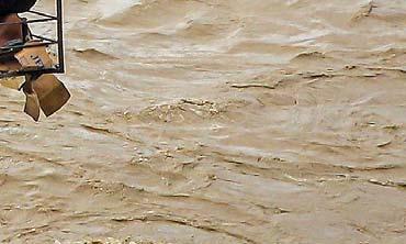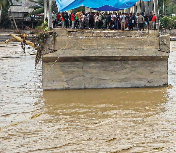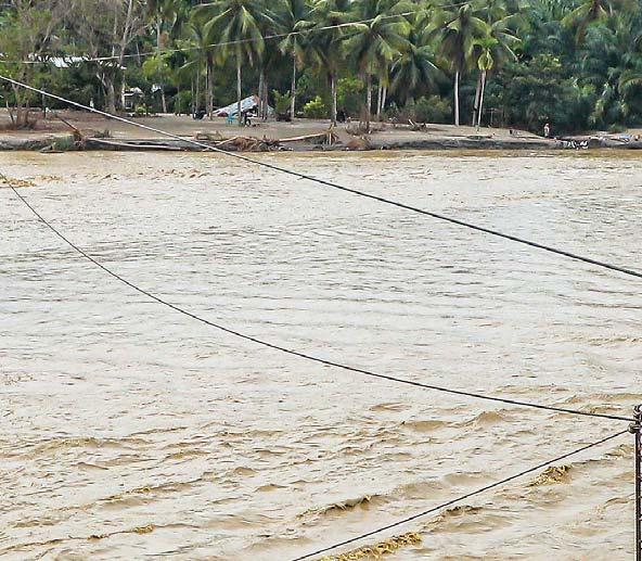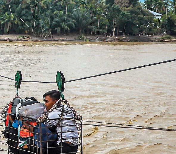 ALTERNATIF: Warga menggunakan alternatif kereta kerek untuk menyeberangi sungai sekaligus menyalurkan bantuan usai jembatan putus akibat banjir bandang di