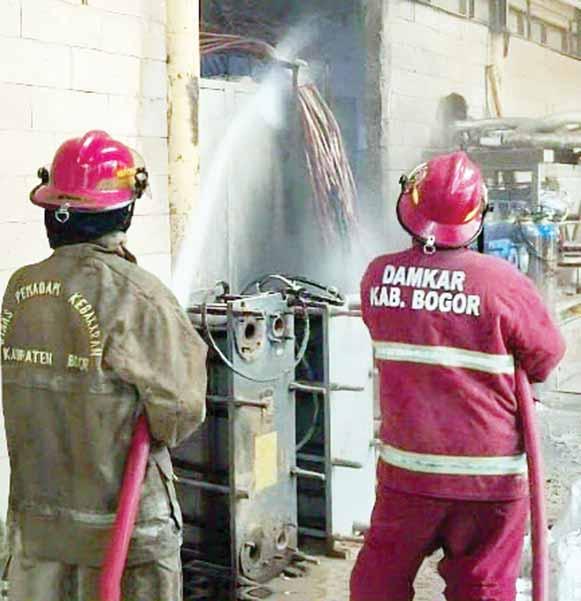 PEMADAMAN: Proses pemadaman mesin trafo yang terbakar akibat korsleting listring di PT YHC Keramika Indonesia, Klapanunggal, Kabupaten Bogor.