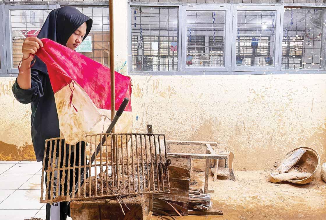 BENDERA KOTOR: Seorang siswa melipat bendera merah putih berlumuran lumpur akibat banjir bandang yang menerjang sekolahnya di Padang, Sumatera Barat, Minggu (7/12). Kini, sudah 921 korban jiwa tercatat akibat bencana yang melanda Aceh, Sumatera Utara, dan Sumatera Barat.