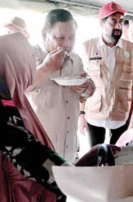 CICIP MAKANAN: Presiden Prabowo mencicipi makanan di posko pengungsian Bireuen, Aceh, Minggu (7/12).