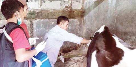 Petugas Kesehatan sedang memberikan vaksin kepada sapi