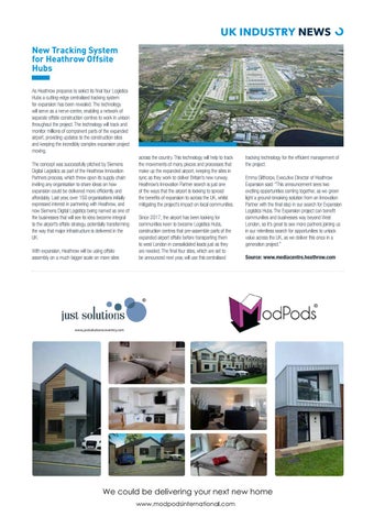UK INDUSTRY NEWS New Tracking System for Heathrow Offsite Hubs As Heathrow prepares to select its final four Logistics Hubs a cutting-edge centralised tracking system for expansion has been revealed. The technology will serve as a nerve-centre, enabling a network of separate offsite construction centres to work in unison throughout the project. The technology will track and monitor millions of component parts of the expanded airport, providing updates to the construction sites and keeping the incredibly complex expansion project moving. The concept was successfully pitched by Siemens Digital Logistics as part of the Heathrow Innovation Partners process, which threw open its supply chain inviting any organisation to share ideas on how expansion could be delivered more efficiently and affordably. Last year, over 150 organisations initially expressed interest in partnering with Heathrow, and now Siemens Digital Logistics being named as one of the businesses that will see its idea become integral to the airport’s offsite strategy, potentially transforming the way that major infrastructure is delivered in the UK. With expansion, Heathrow will be using offsite assembly on a much bigger scale on more sites