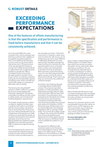 2 given a better understanding of the building system and details. Fewer tests need to be carried out before the system can be used onsite, albeit with various conditions. The use of dedicated site assembly teams is another consideration as well as end-to-end formal QA systems such as BOPAS. Robust Details is working with these other QA system providers to understand what their scope is so that as much as possible of the sound insulation inspection information is shared by the inspection bodies, thus saving duplication of effort and reducing costs. Robust Details will still need to carry out onsite sampling as there are always potential ways in which site assembly and other activities can compromise sound performance. However, for volumetric systems in the robustdetails® scheme there will be no need to carry out PCT testing on site. This is just another way of reducing risk and increasing certainty for users, which is all part of the benefits package of offsite construction. For more information visit: www.robustdetails.com
