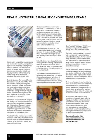 REALISING THE TRUE U-VALUE OF YOUR TIMBER FRAME The aluminium foil forms a radiant barrier when facing a ≥20mm air space (≥13mm in roofs) creating a low emissivity cavity which significantly reduces heat loss. Protect VC Foil Ultra raises the thermal resistance of the airspace from 0.18m2K/W to 0.78m2K/W in the wall (0.53m2K/W in the roof) when fixed as per standard timber frame practice/stud and rafter centres. This provides a significant thermal improvement to the construction without adding to the wall/roof thickness. The installation success of any AVCL is in the sealing of laps and junctions, not just the integrity of the membrane itself. Protect VC Foil Ultra is also available with integral “lap and seal” technology to ensure a full proof seal at the laps. It is now widely accepted that insulation plays a vital role in modern properties, in simple terms, improved levels of insulation and airtightness mean that more heat is retained within the building for longer at less cost – subject of course to good construction methods. Matt McAndry, Director of Technical at Building Product Design Ltd (of which Protect Membranes is a division) explains more. Design U-values can often be very different to those achieved ‘as built’. Research has shown that convection paths or gaps through the building construction can lead to significant heat loss as well as mass moisture vapour migration with the associated risk of harmful condensation forming. Therefore, to truly gain the best performance from any insulant, the aim is to deliver an air and vapour control layer/barrier on the warm side. Timber frame has been traditionally designed with an integral air and vapour layer (AVCL) in the form of the polythene sheet on the warm side of the insulation. The need to maintain the integrity of the AVCL to prevent it being compromised by penetrations has led to the widespread use of a service cavity between this layer and the internal lining boards. Protect VC Foil Ultra, an air and vapour control membrane, with its high purity, solid aluminium foil facing and tough nonwoven spunbond core, combines the necessary AVCL qualities with low emissivity technology
