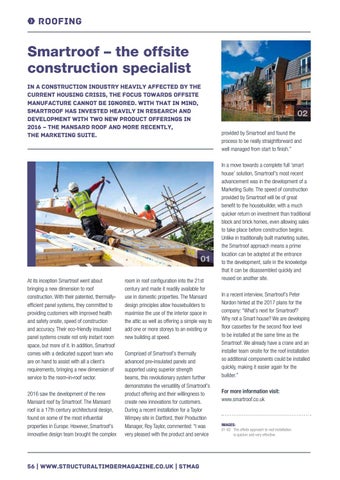 02 provided by Smartroof and found the process to be really straightforward and well managed from start to finish.” In a move towards a complete full ‘smart house’ solution, Smartroof’s most recent advancement was in the development of a Marketing Suite. The speed of construction provided by Smartroof will be of great benefit to the housebuilder, with a much quicker return on investment than traditional block and brick homes, even allowing sales to take place before construction begins. Unlike in traditionally built marketing suites, the Smartroof approach means a prime location can be adopted at the entrance to the development, safe in the knowledge that it can be disassembled quickly and reused on another site. In a recent interview, Smartroof’s Peter Nordon hinted at the 2017 plans for the company: “What’s next for Smartroof? Why not a Smart house? We are developing floor cassettes for the second floor level to be installed at the same time as the Smartroof. We already have a crane and an installer team onsite for the roof installation so additional components could be installed quickly, making it easier again for the builder.” For more information visit: www.smartroof.co.uk
