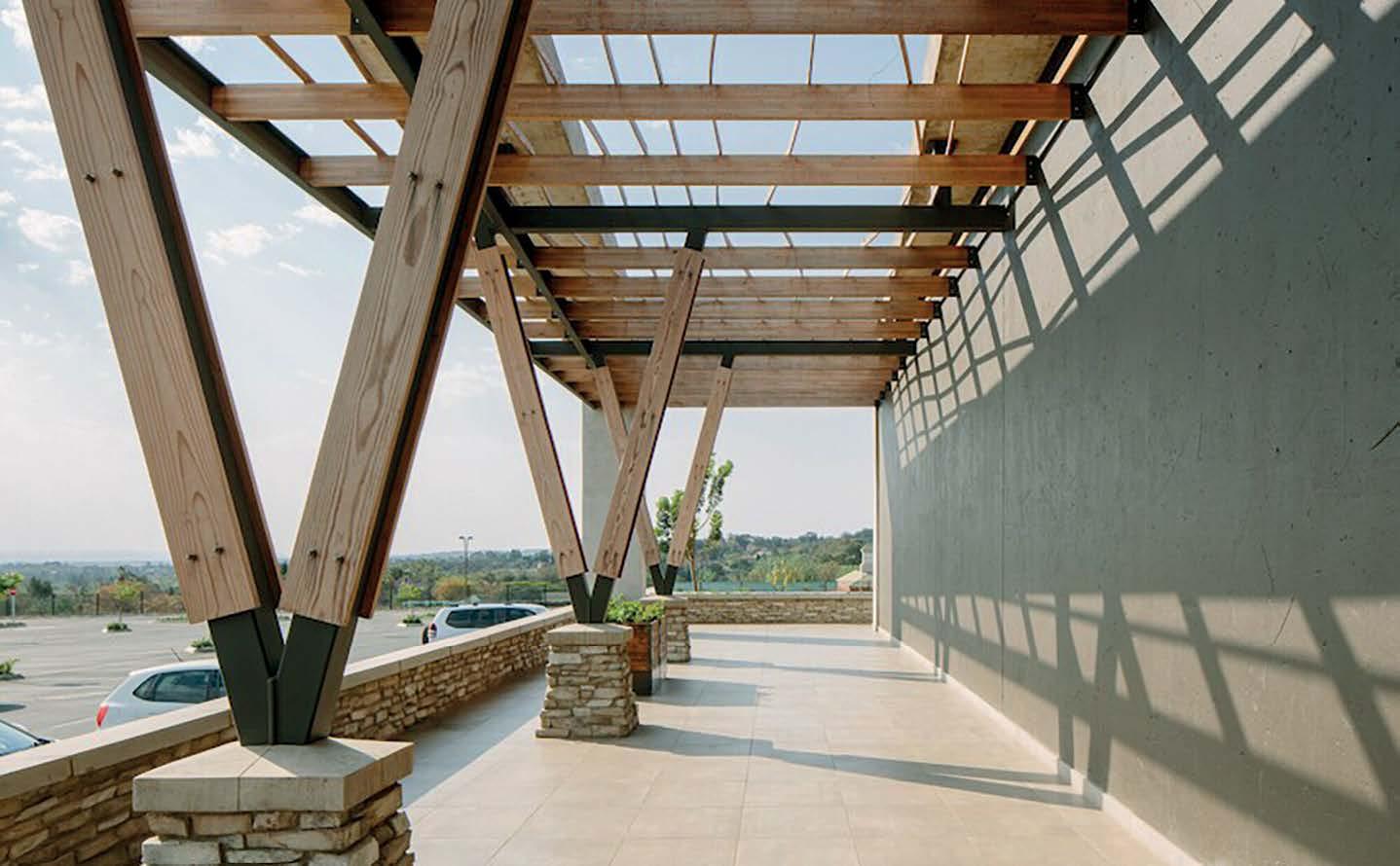 Internal beams, curved elements or visually exposed features may suit locally manufactured GL20, while longer spans or highly loaded elements may justify imported higher grades. The visual finish is controlled by visual grading, not strength grade, meaning exposed GL20 glulam can be finished to the same aesthetic standard as GL24.