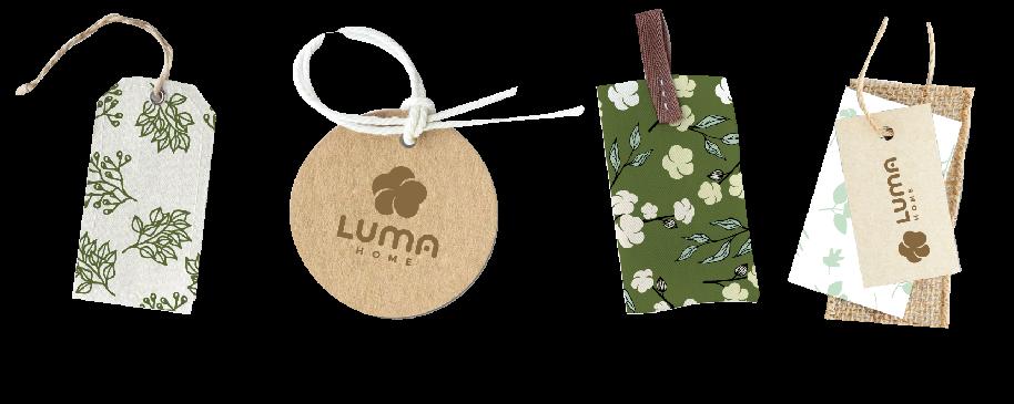The image shows four tag options for the Luma brand. The concept features a dual-tag approach: a kraft paper tag paired with a fabric swatch. This allows customers to feel the material quality and see the actual product color without unpacking the item.