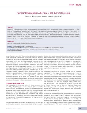 Keywords Fulminant myocarditis, lymphocytic, giant cell, eosinophilic Disclosure: The authors have no conflict of interest to declare. Received: 19 November 2017 Accepted: 23 January 2018 Citation: US Cardiology Review 2018;12(1):13–6. DOI: 10.14520/usc.2017:31:1 Correspondence: Emily Seif, University of Rochester Medical Center, 601 Elmwood Ave, Box 679A, Rochester, NY 14642, USA. E: Emily_Seif@URMC.Rochester.edu