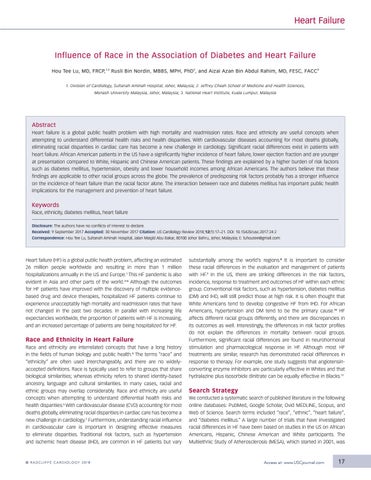 Keywords Race, ethnicity, diabetes mellitus, heart failure Disclosure: The authors have no conflicts of interest to declare. Received: 9 September 2017 Accepted: 30 November 2017 Citation: US Cardiology Review 2018;12(1):17–21. DOI: 10.15420/usc.2017:24:2 Correspondence: Hou Tee Lu, Sultanah Aminah Hospital, Jalan Masjid Abu Bakar, 80100 Johor Bahru, Johor, Malaysia; E: luhoutee@gmail.com