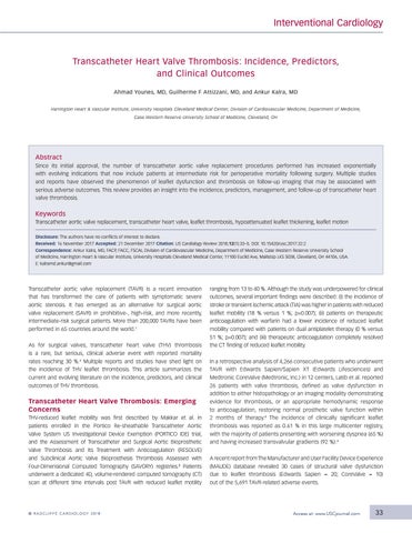 Keywords Transcatheter aortic valve replacement, transcatheter heart valve, leaflet thrombosis, hypoattenuated leaflet thickening, leaflet motion Disclosure: The authors have no conflicts of interest to declare. Received: 16 November 2017 Accepted: 21 December 2017 Citation: US Cardiology Review 2018;12(1):33–5. DOI: 10.15420/usc.2017:32:2 Correspondence: Ankur Kalra, MD, FACP, FACC, FSCAI, Division of Cardiovascular Medicine, Department of Medicine, Case Western Reserve University School of Medicine, Harrington Heart & Vascular Institute, University Hospitals Cleveland Medical Center, 11100 Euclid Ave, Mailstop LKS 5038, Cleveland, OH 44106, USA. E: kalramd.ankur@gmail.com