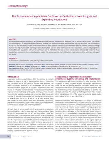 The Subcutaneous Implantable Cardioverter-Defibrillator: New Insights and Expanding Populations Thomas A Turnage, MD, John A Kpaeyeh Jr, MD, and Michael R Gold, MD, PhD Division of Cardiology, Medical University of South Carolina, Charleston, SC