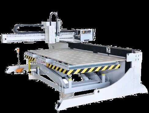 Automatic panel loading with vacuum foot devices located on the bridge for material pickup from a lifting table. Au tomatic unloading with a device on the bridge for transferring processed pieces to a special conveyor belt.