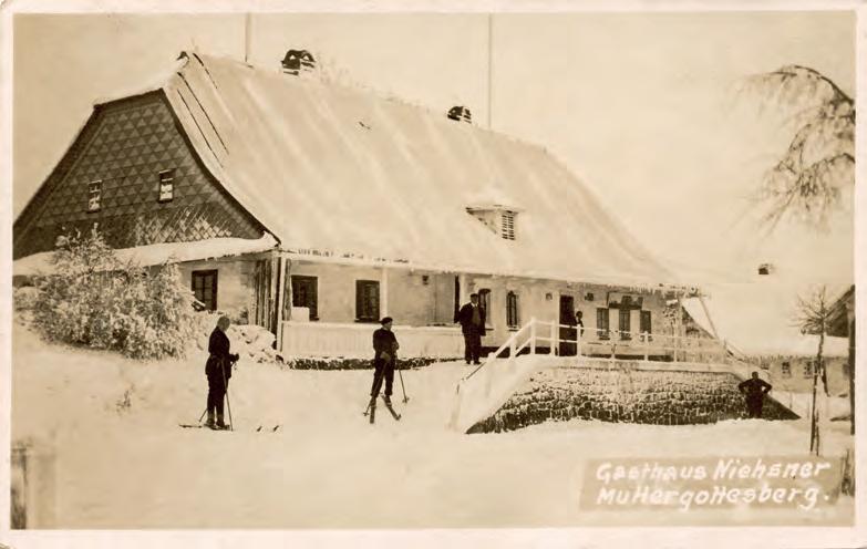 Lyžaři před hostincem při cestě ke klášteru / Skifahrer vor dem Gasthof am Weg zum Kloster