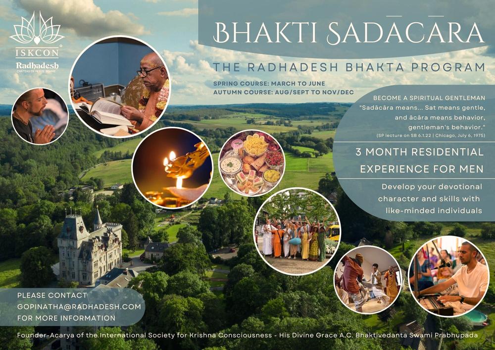 We would like to invite potential candidates to our upcoming three month Radhadesh Bhakta Program called "Bhakti Sadācāra", from the end of August 2023 to the end of November 2023 Please help us spread the word and direct towards us any potential candidates that are ready to have a residential experience within our Radhadesh temple ashram