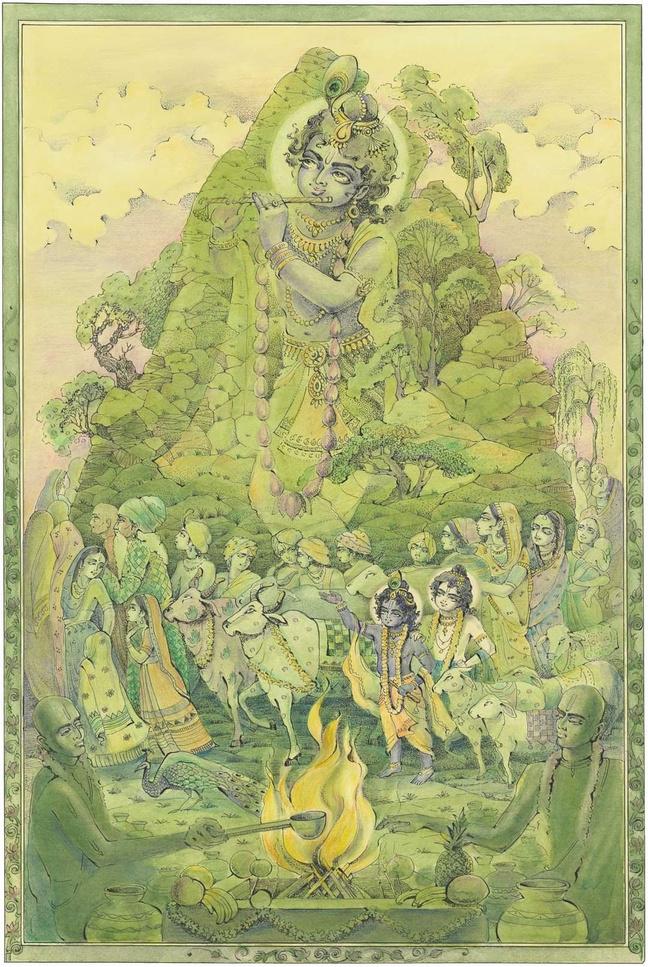 Krishna zei toen dat de koeien zelfs door de halfgoden aanbeden worden en Hij demonstreerde praktisch hoe de koeien beschermd moeten worden.