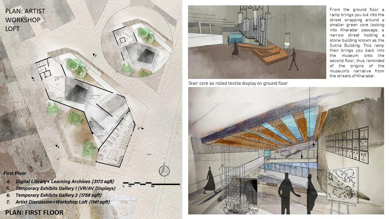 This thesis project was an investigation of the museum typology by identifying the institution’s evolving definitions and weighing its potential to frame and enable community identity in Karachi. Recognizing the city as a complex weave of different groups, instead of a single monolithic museum, multiple small community museums are advocated. The neighborhoods of KharaMithadar are chosen as a starting point to test this. Its identity is a tangle of different threads (religion, language, trade, the built environment, profession, cuisine) that in the urban context takes the form of trails. The spatial logic of navigating the labyrinthine streets whilst salvaging the origins of the museum as a place to think, be inspired and learn while engaging in dialogue become the tools to explore the spatial experience and program of this project.
