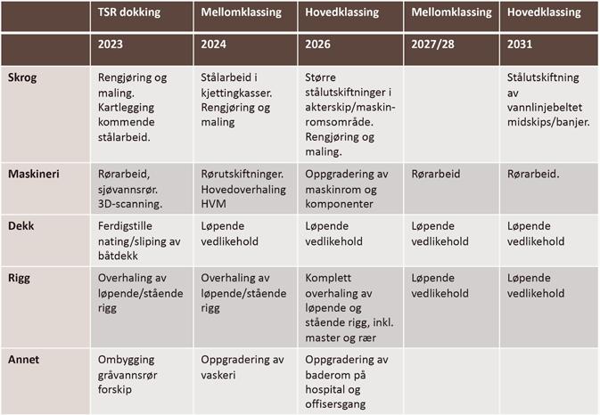 og tynnere stålplater. Utskiftning av plater, som i stor grad skal klinkes, er både tidkrevende og dyrt. Vi har beregnet å gjøre større utskiftninger i forbindelse med hovedklassing 2026 og 2031. Foreløpige tall viser et finansieringsbehov fra kr 70 til kr 100 mill. Dette blir den store utfordringen og vi jobber med ulike ideer på hvordan dette skal finansieres.