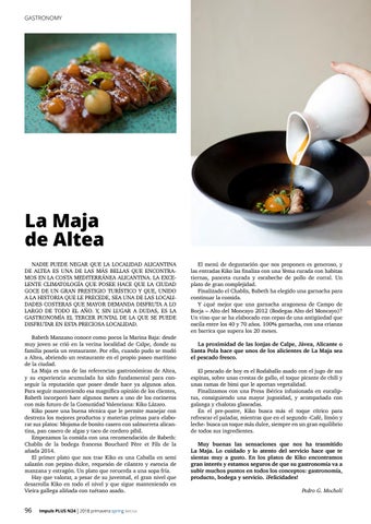 La Maja de Altea NADIE PUEDE NEGAR QUE LA LOCALIDAD ALICANTINA DE ALTEA ES UNA DE LAS MÁS BELLAS QUE ENCONTRAMOS EN LA COSTA MEDITERRÁNEA ALICANTINA. LA EXCELENTE CLIMATOLOGÍA QUE POSEE HACE QUE LA CIUDAD GOCE DE UN GRAN PRESTIGIO TURÍSTICO Y QUE, UNIDO A LA HISTORIA QUE LE PRECEDE, SEA UNA DE LAS LOCALIDADES COSTERAS QUE MAYOR DEMANDA DISFRUTA A LO LARGO DE TODO EL AÑO. Y, SIN LUGAR A DUDAS, ES LA GASTRONOMÍA EL TERCER PUNTAL DE LA QUE SE PUEDE DISFRUTAR EN ESTA PRECIOSA LOCALIDAD. Babeth Manzano conoce como pocos la Marina Baja: desde muy joven se crió en la vecina localidad de Calpe, donde su familia poseía un restaurante. Por ello, cuando pudo se mudó a Altea, abriendo un restaurante en el propio paseo marítimo de la ciudad. La Maja es una de las referencias gastronómicas de Altea, y su experiencia acumulada ha sido fundamental para conseguir la reputación que posee desde hace ya algunos años. Para seguir manteniendo esa magnífica opinión de los clientes, Babeth incorporó hace algunos meses a uno de los cocineros con más futuro de la Comunidad Valenciana: Kiko Lázaro. Kiko posee una buena técnica que le permite manejar con destreza los mejores productos y materias primas para elaborar sus platos: Mojama de bonito casero con salmorreta alicantina, pan casero de algas y taco de cordero pibil. Empezamos la comida con una recomendación de Babeth: Chablis de la bodega francesa Bouchard Père et Fils de la añada 2014. El primer plato que nos trae Kiko es una Caballa en semi salazón con pepino dulce, requesón de cilantro y esencia de manzana y estragón. Un plato que recuerda a una sopa fría. Hay que valorar, a pesar de su juventud, el gran nivel que desarrolla Kiko en todo el nivel y que sigue manteniendo en Vieira gallega aliñada con tuétano asado.