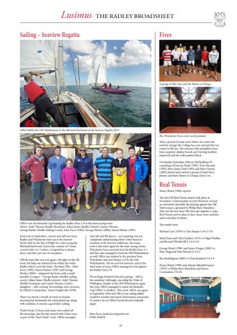 Real Tennis Henry Brind (1996) reports: The first OR Real Tennis match took place in November. Unfortunately we lost! However, we had an extremely enjoyable day playing against the Old Malvernians captained by Philip Shaw-Hamilton. This was the first time ORs have got together to play Real Tennis and we plan to have many more matches and social days in future. ORSA won the Rickards Cup beating the Radley Boys 2-0 in the team racing event. Above: Andy Thomas (Radley Boatman), Julian James (Radley Parent), Lauren Thomas, George Barker (Radley Sailing Coach), Jules Facer (1982), George Pitcher (2004), Simon Palmer (1987) Each year in September, current and old boys from Radley and Winchester meet up at the Seaview Yacht Club on the Isle of Wight for a day racing the Mermaid keel boats. Each team consists of 3 boats crewed with 2 or 3 sailors. Competition is always fierce, and this year was no exception. ORSA’s team this year was again a bit light on the OR front, but help was enlisted from within the wider Radley fold to crew the boats. The three ORs – Jules Facer (1982), Simon Palmer (1987) and George Pitcher (2004) – skippered the boats with a small handful of ringers – George Barker (Radley sailing coach), Julian James (Radley parent), Andy Thomas (Radley boatman) and Lauren Thomas (Andy’s daughter) – ably crewing. Proceedings were overseen by ORSA’s Commodore, Alexis Dogilewski (1958).