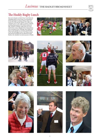 Lusimus . THE RADLEY BROADSHEET The Huddy Rugby Lunch The event took place in Clock Tower Court before the Tonbridge match on 3rd October. It was attended by friends and family of Anthony Hudson (Tutor of F Social 1970-1984 and Sub Warden 1979-1988). Over a hundred came to ‘raise a glass’ in memory of Huddy, including all generations of the Hudson family, the Silks, members of Huddy’s rugby teams, his Social and his forms, many colleagues from Common Room and several guests from Tonbridge where Huddy had been as a boy and later as a Governor and President of The Old Tonbridgian Society. The Warden warmly welcomed all assembled and was followed by Mark Rushton who rekindled very fond memories of Huddy.