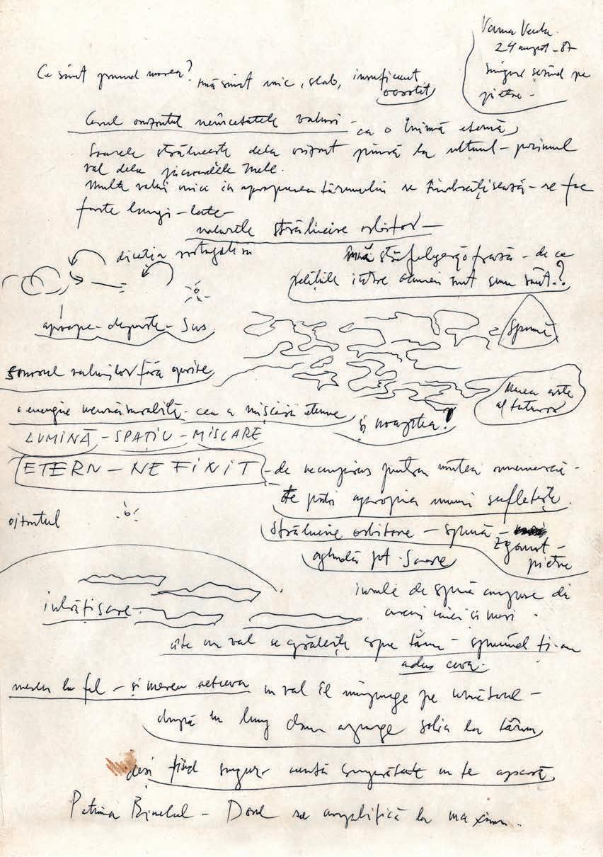 Experienţă mistică: 1962 - Braşov, practica de vară a studenţilor. Şedeam în lanul de grâu. Căldură mare. Lumină puternică. Culorile de ulei păreau fără putere... Cu palma strânsă, am privit în soare şi printre degete a pătruns o rază de lumină. Am văzut imagini sublime, neverosimile. Era o revelaţie. Am notat în caietul meu desenul imaginilor, ordinea liniilor colorate. În anul 1970 am făcut o primă machetă.