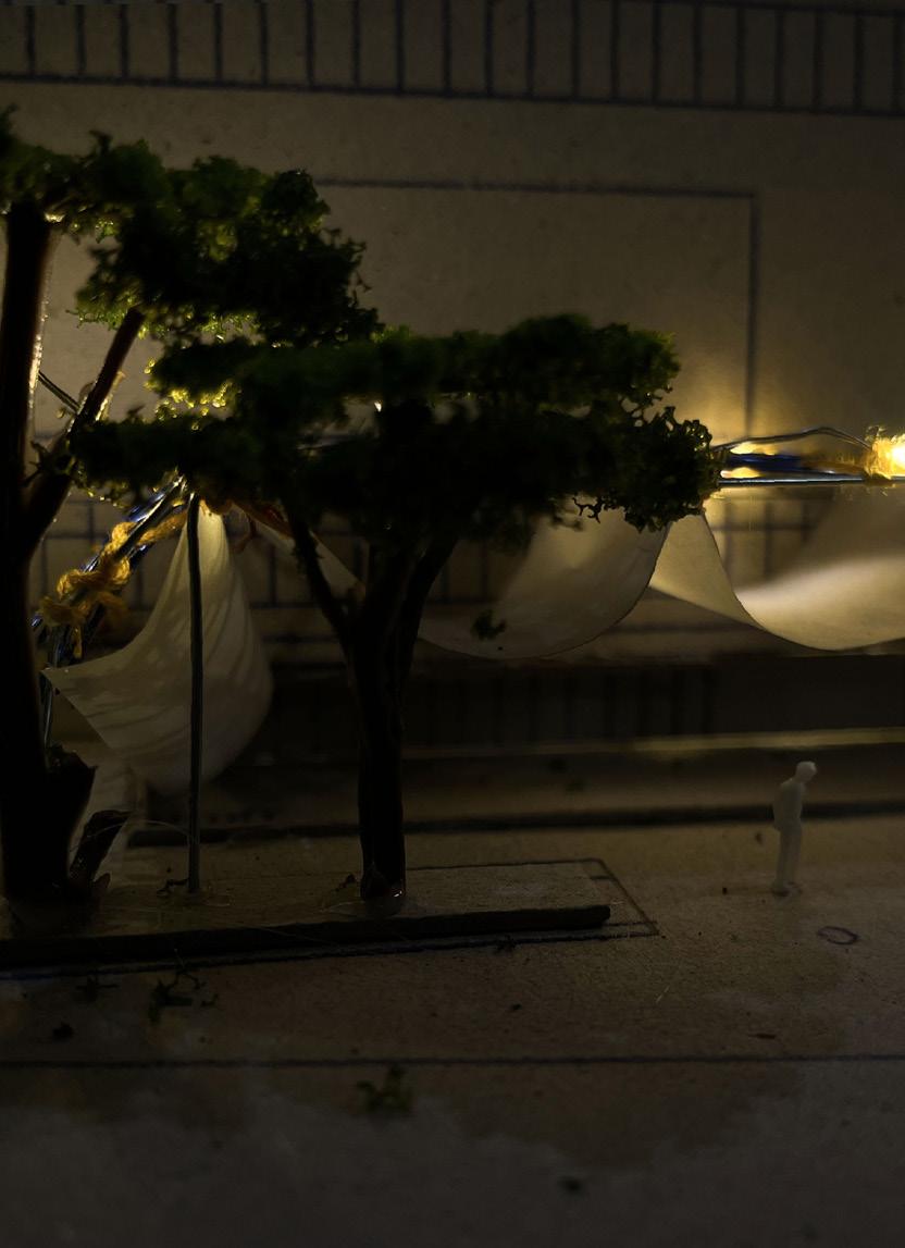 In the dark, the light at the end of the structure of the woven bridge will be illuminated. The bright space will be seen more in its structure - which may look like a canopy. It provides a space for people passing by to rest and relax.