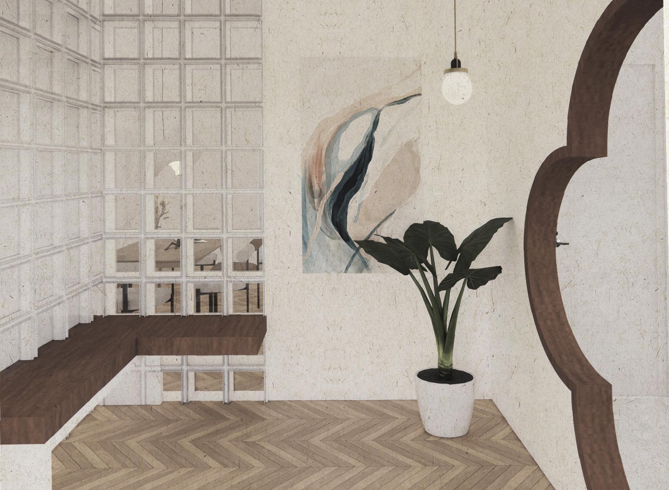 This space blends living and creative functions. Instead of fully enclosed rooms, it features open areas with subtle gaps, allowing light to flow and fostering connection. These openings encourage artistic exchange, creating a dynamic environment where ideas can move freely, even as each artist retains their privacy. The space is flexible, adaptable to both rest and creativity, reflecting the collaborative nature of artistic life.