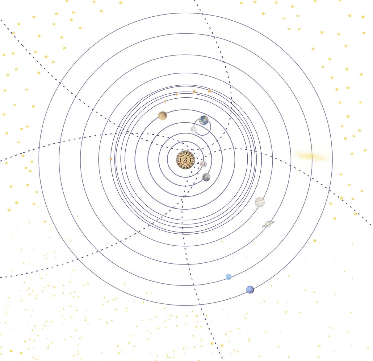 The spatial arrangement of stars in the solar system is reinterpreted to define functional zones. Geometric alignments are analyzed and refined through color, creating distinct planetary divisions.