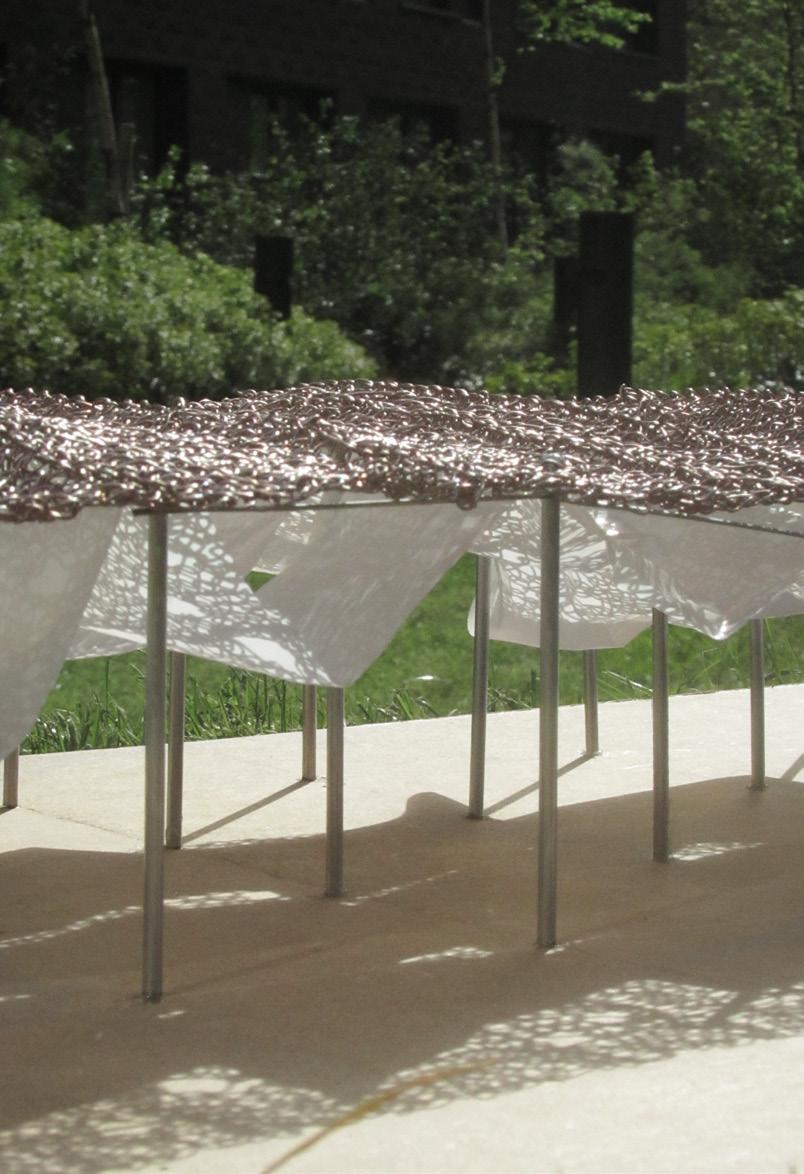 In the rain, woven metal wires can help gather more rainwater. Combined with the sound of the raindrops, the collected rainwater will drip down the middle of the fabric into a bucket on the ground. It can also create an acoustic dialogue in the rain.