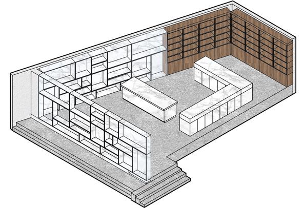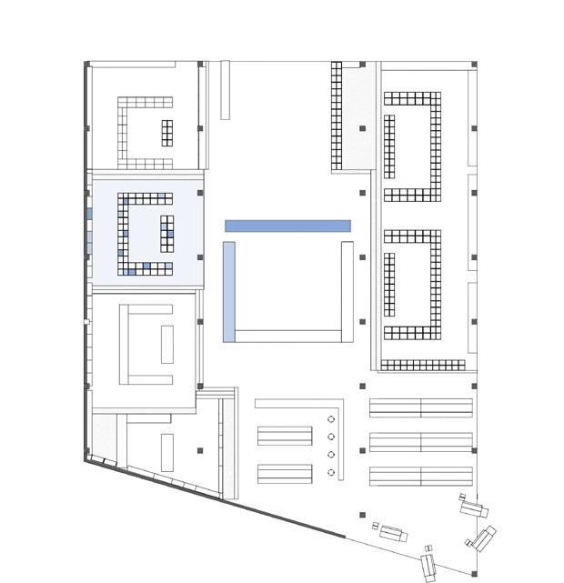 This diagram illustrates the spatial structure of the market, with the groceries area divided into specific zones: meat, seafood, grains, spices, fruits and vegetables, breakfast stalls, public kitchen, and seating. Each zone is designed with the flow of a kitchen island in mind, enhancing the efficiency of movement and supporting the "neighborhood" concept by fostering a communal, interactive shopping experience.