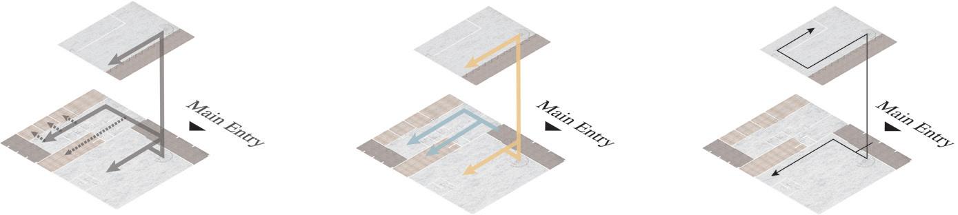 This diagram illustrates the spatial transparency strategy— ensuring clear sightlines along three key axes. Every public space remains visually connected and open, enhancing the sense of flow and shared presence.The layout allows users to see through the entire public zone in three key directions—creating openness, orientation, and moments of connection.