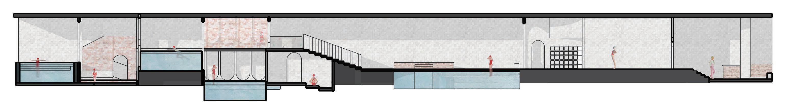The renovated Madeira Terrace in Brighton is a walkway facing south toward the sea and standing against the cliff behind. The project revitalises this stretch of coastline by renovating the elegant historic space with a modern water fitness and therapy centre.
