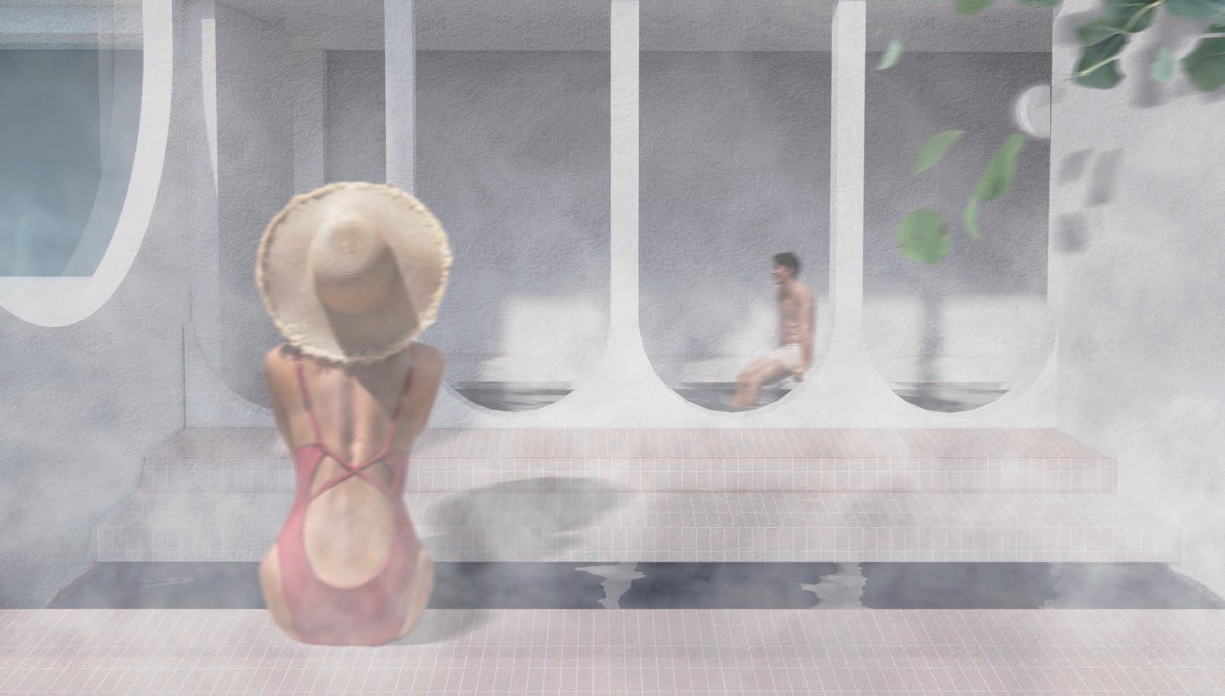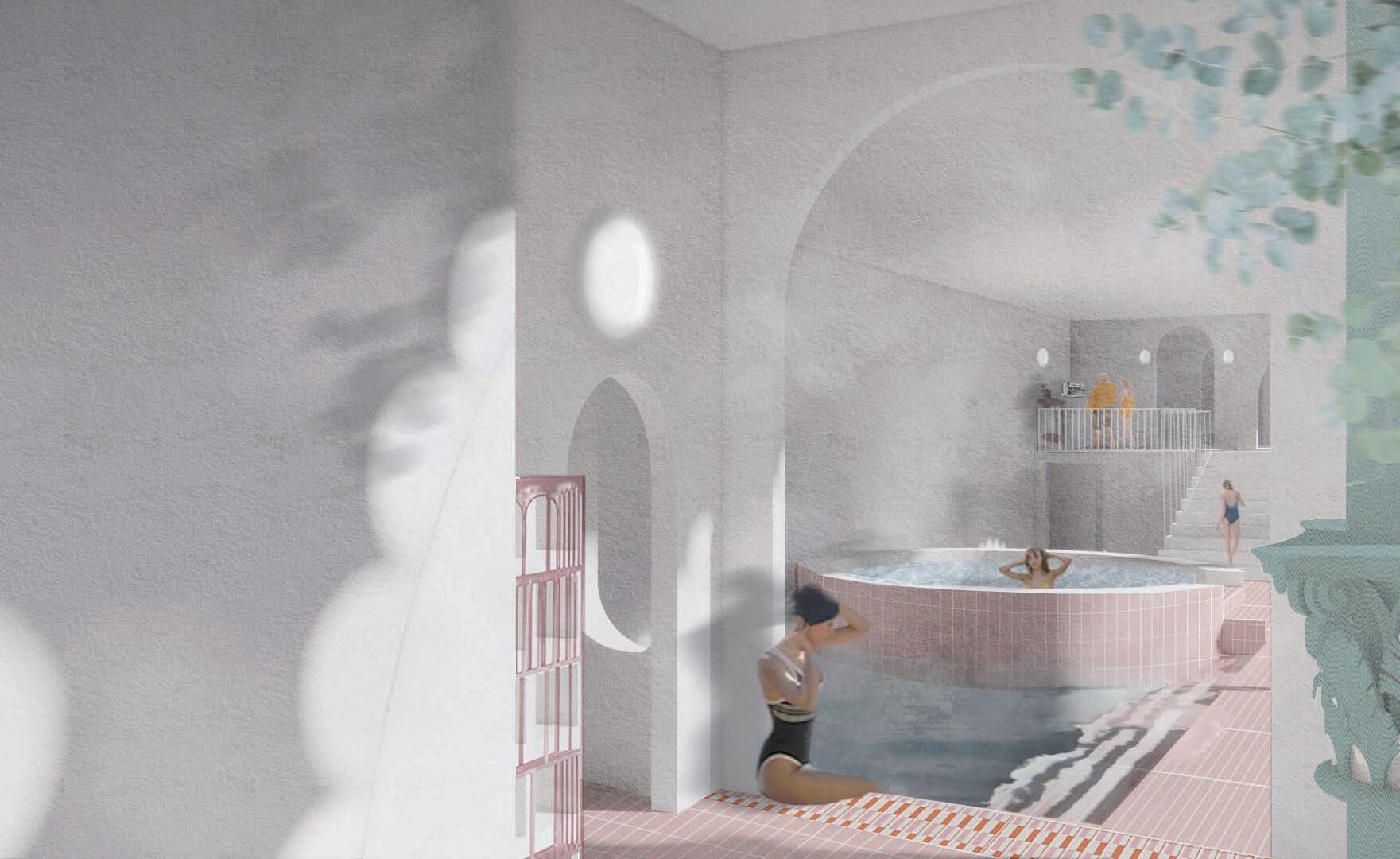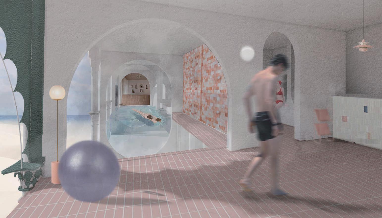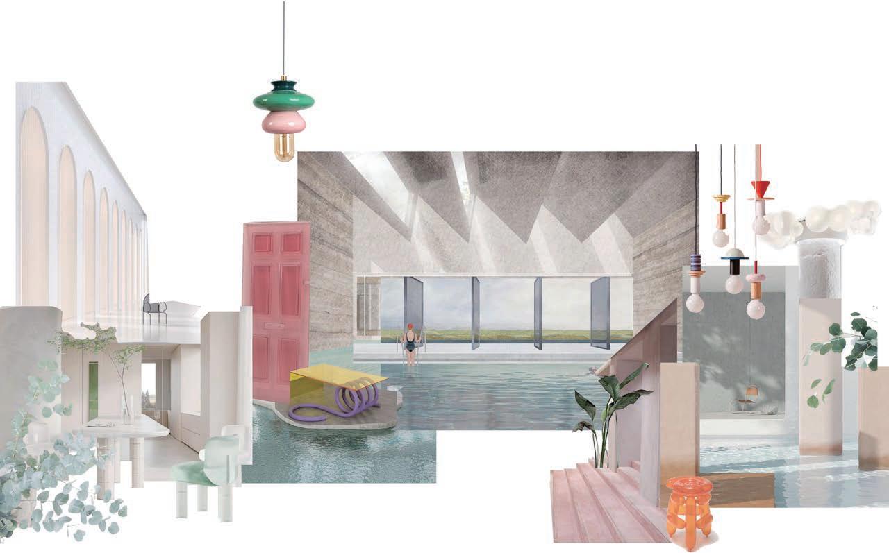 Inspired by Madeira Terrace’s red brick and cast iron, and the textures of Bath Spa, the design uses carbon ceramics and therapeutic salt bricks. A balanced palette draws from color therapy: light blue echoes the sea, soft pink warms the space while referencing local brick, and blue-green deepens the connection to nature. Muted pink flooring contrasts cooler tones, adding gentle energy.