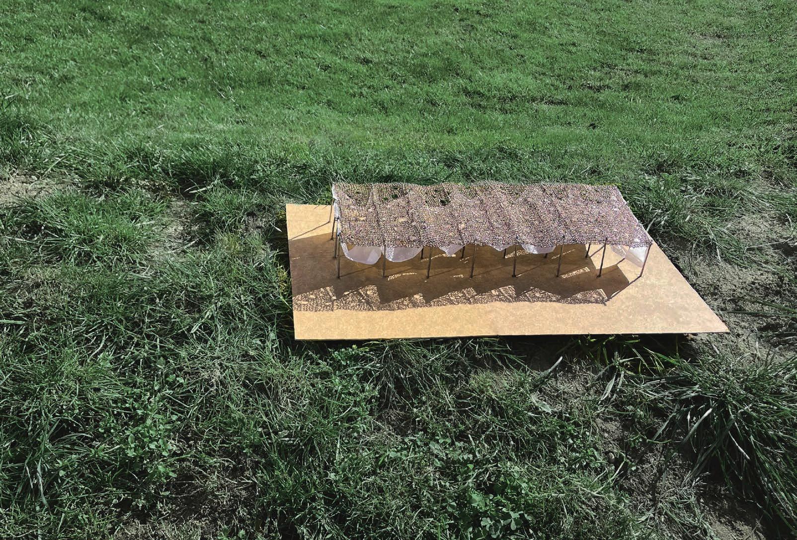 In the sunlight, the woven patterns are reflected in the ground and fabric. As the wind blows, the pattern of the space would move with the sunlight and shadows.