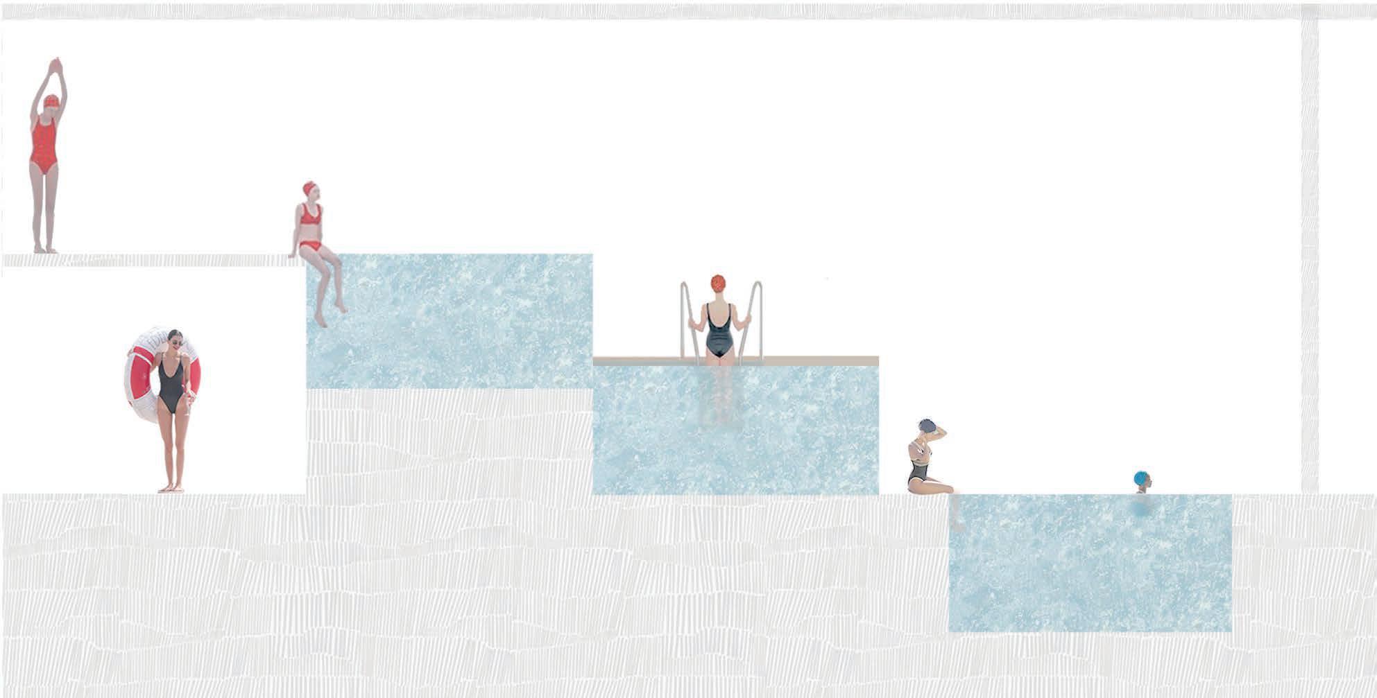 The sightline analysis informed the decision to elevate the pool above ground, ensuring indoor views align with those of pedestrians outside. A recessed pool would limit visibility to ground level. An exception is the heated pool, where condensation on the glass obscures the view regardless of its placement.