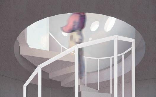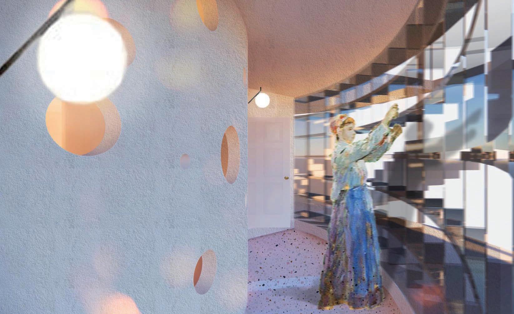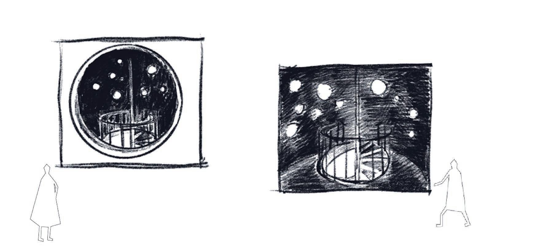 The rooftop lighthouse shifts with time — glowing like a star at night, it becomes a quiet beacon above the art center. By day, it turns into a viewing point, offering expansive views of the landscape. The spiral staircase leading up is dotted with circular openings, letting light filter through. As sunlight moves, it casts scattered patterns inside, making the rooms below sparkle like starlight caught in the daytime.