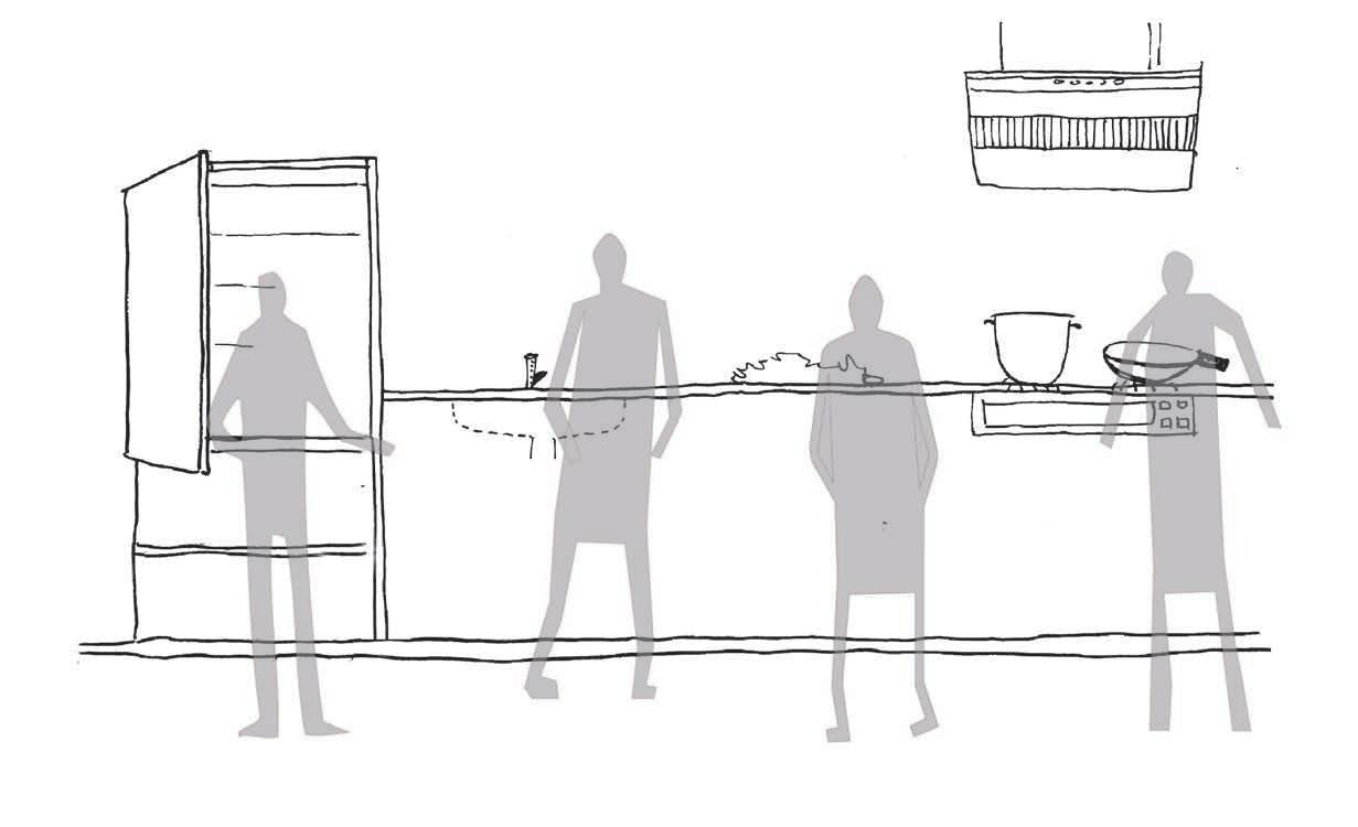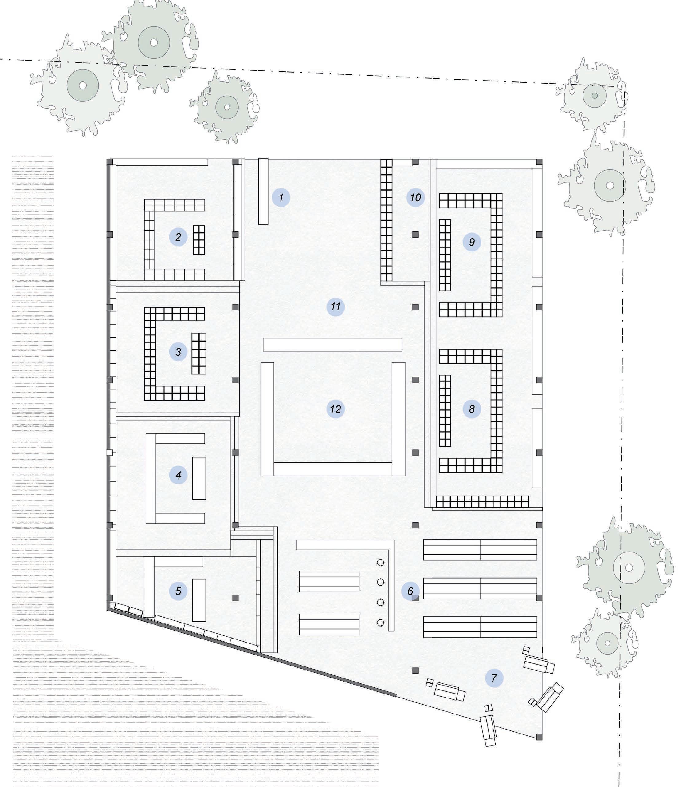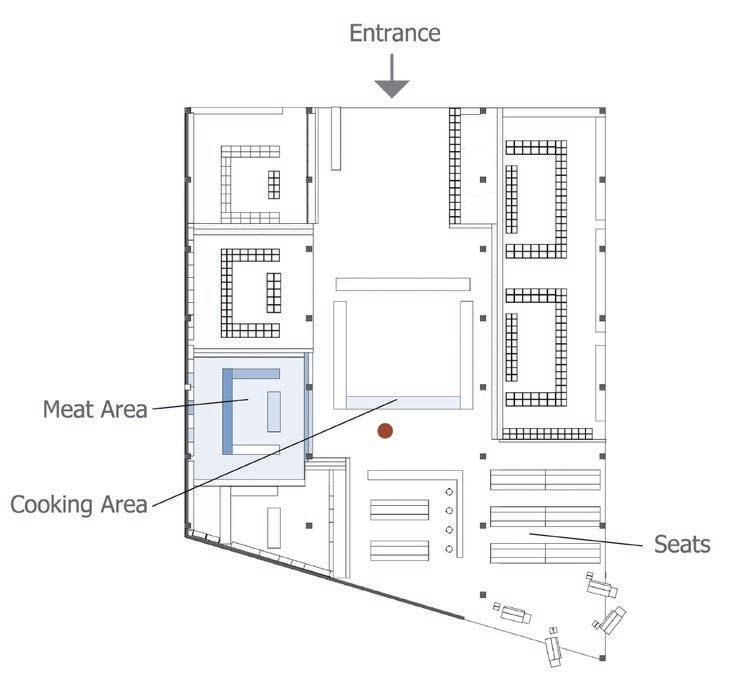 This diagram illustrates the spatial structure of the market, with the groceries area divided into specific zones: meat, seafood, grains, spices, fruits and vegetables, breakfast stalls, public kitchen, and seating. Each zone is designed with the flow of a kitchen island in mind, enhancing the efficiency of movement and supporting the "neighborhood" concept by fostering a communal, interactive shopping experience.