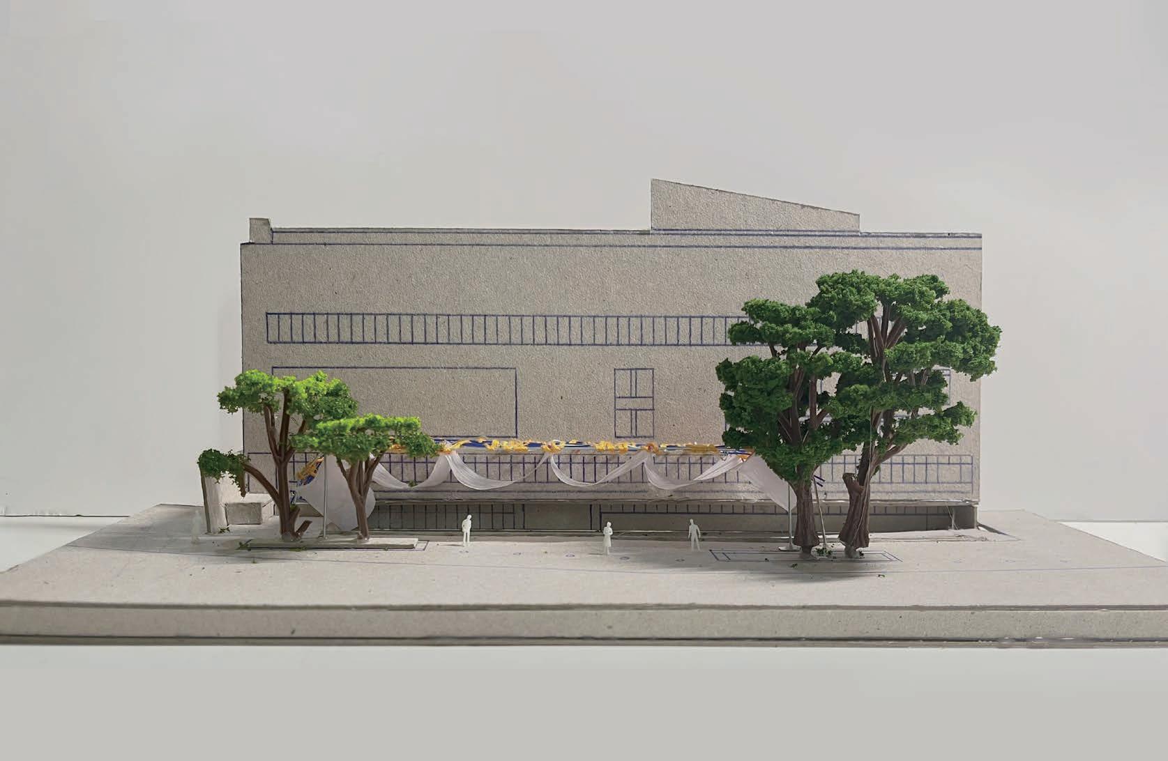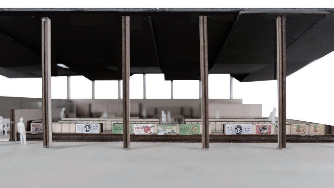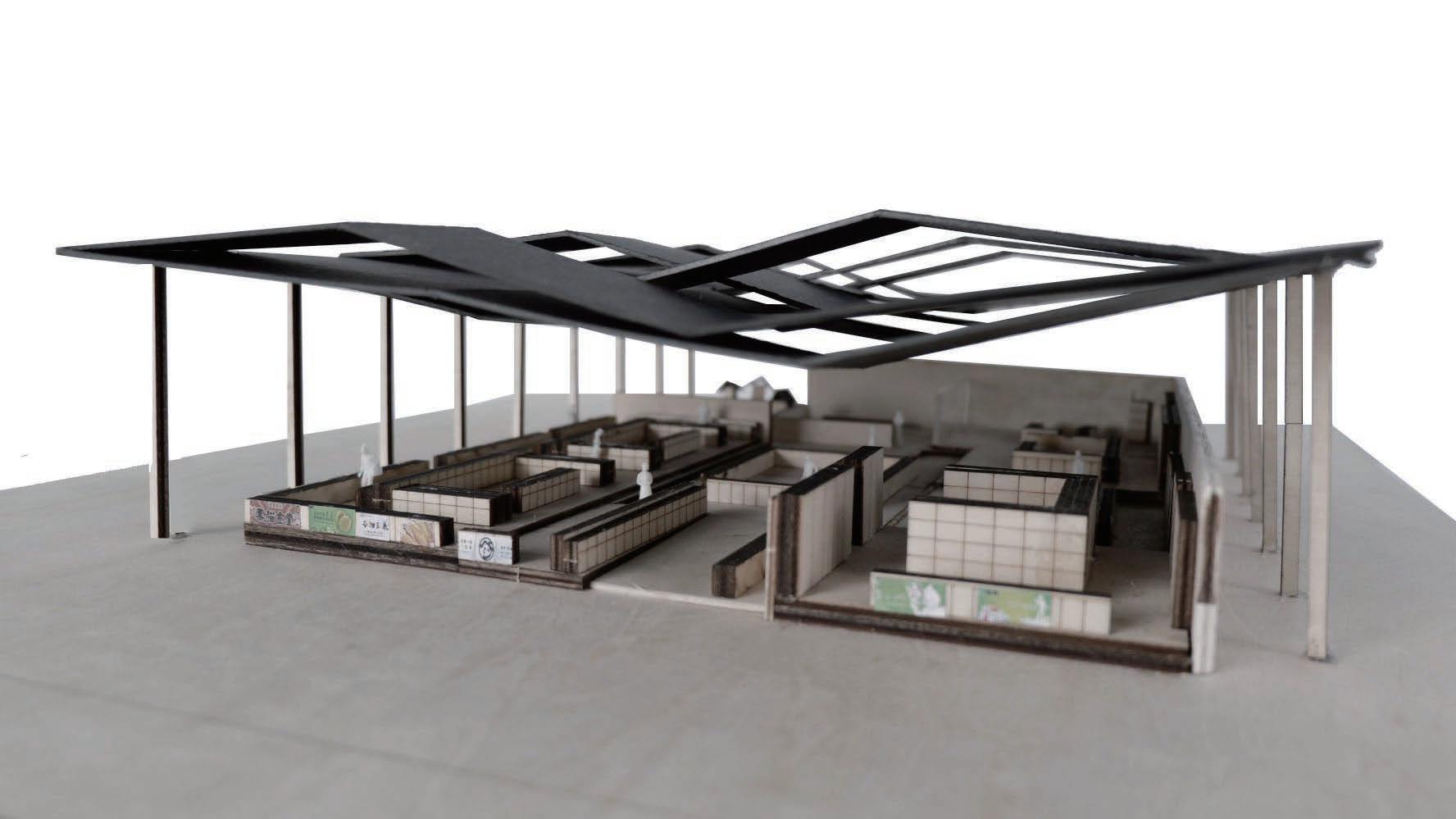 This handcrafted model primarily showcases the spatial structure of the market, emphasizing its form and integration within the high-density neighborhood. Rather than detailing specific functional spaces, it focuses on the overall form, scale, and spatial flow, highlighting the relationship between the market and its urban context.