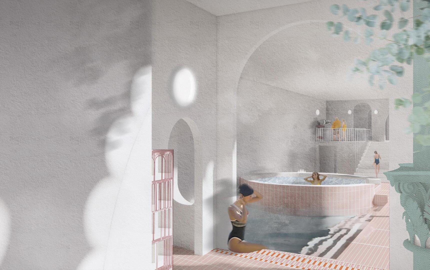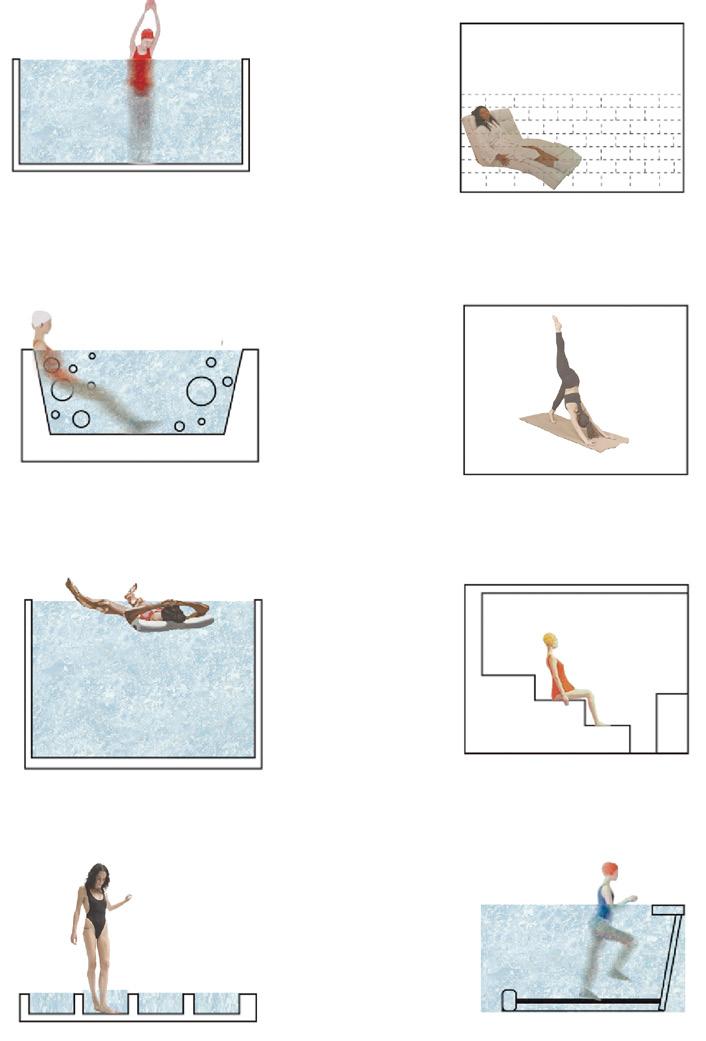 Sightline analysis played a key role— raising the main pools above ground allows pedestrians outside to visually connect with the space inside, creating a sense of openness and dialogue. The only exception is the heated pool, where condensation naturally blurs the boundary regardless of elevation.